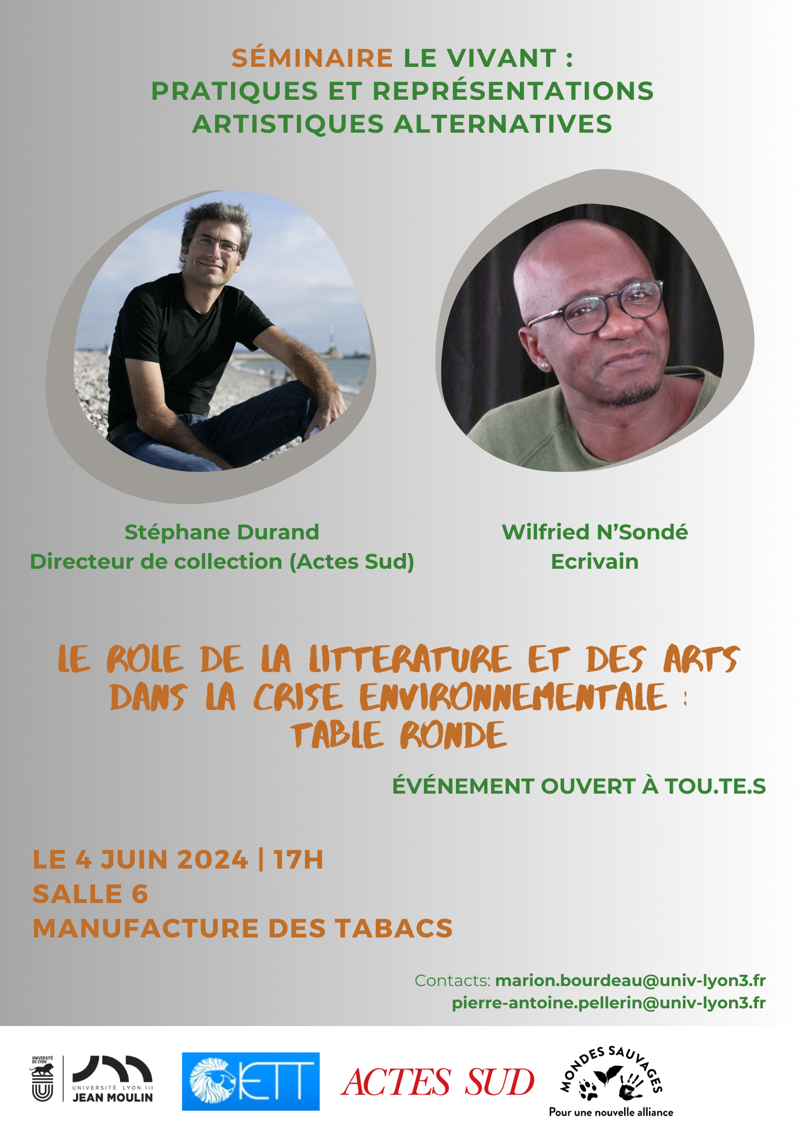 Mardi 4 juin 2024, (Manufacture des Tabacs) : « Le rôle de la littérature et des arts dans la crise environnementale », table ronde avec Wildried N’Sondé, écrivain, et Stéphane Durant, directeur de la collection « Mondes Sauvages » chez Actes Sud